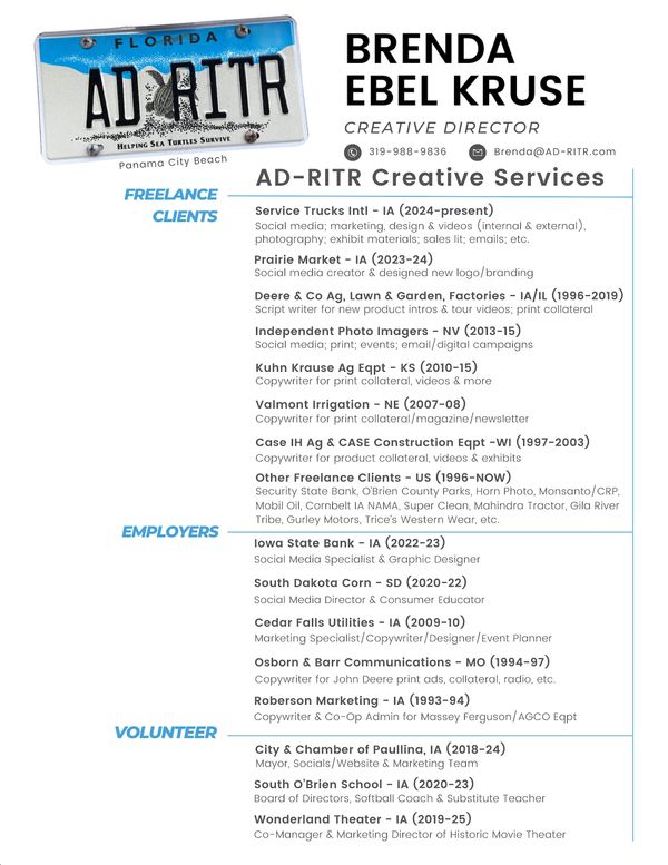 Experienced senior creative marketing professional driven to accelerate your brand. You need marketing materials that shift your sales figures into a higher gear so you can lap the pack. From NW Iowa to St Louis to NW New Mexico to NE Iowa to Vegas back to NW Iowa & now to NW Florida...no matter where I go, the AD-RITR always has the pedal to the metal!