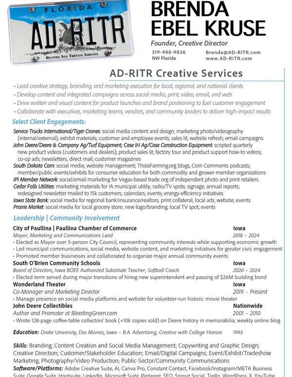 Experienced senior creative marketing professional driven to accelerate your brand. You need marketing materials that shift your sales figures into a higher gear so you can lap the pack. From NW Iowa to St Louis to NW New Mexico to NE Iowa to Vegas back to NW Iowa & now to NW Florida...no matter where I go, the AD-RITR always has the pedal to the metal!